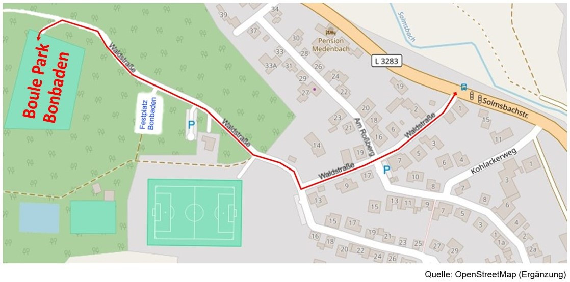 In Bonbaden, von der Solmsbachstraße kommend, in Waldstraße einbiegen, über erste Kreuzung geradeaus, dann nächste Kreuzung rechts fahren, ab hier nur noch geradeaus, am Vereinsheim des TuS 1913 Bonbaden e.V. vorbei, ebenso an einem kleinen Parkplatz sowie am Festplatz Bonbaden, dann nach ca. 150 m links einbiegen.